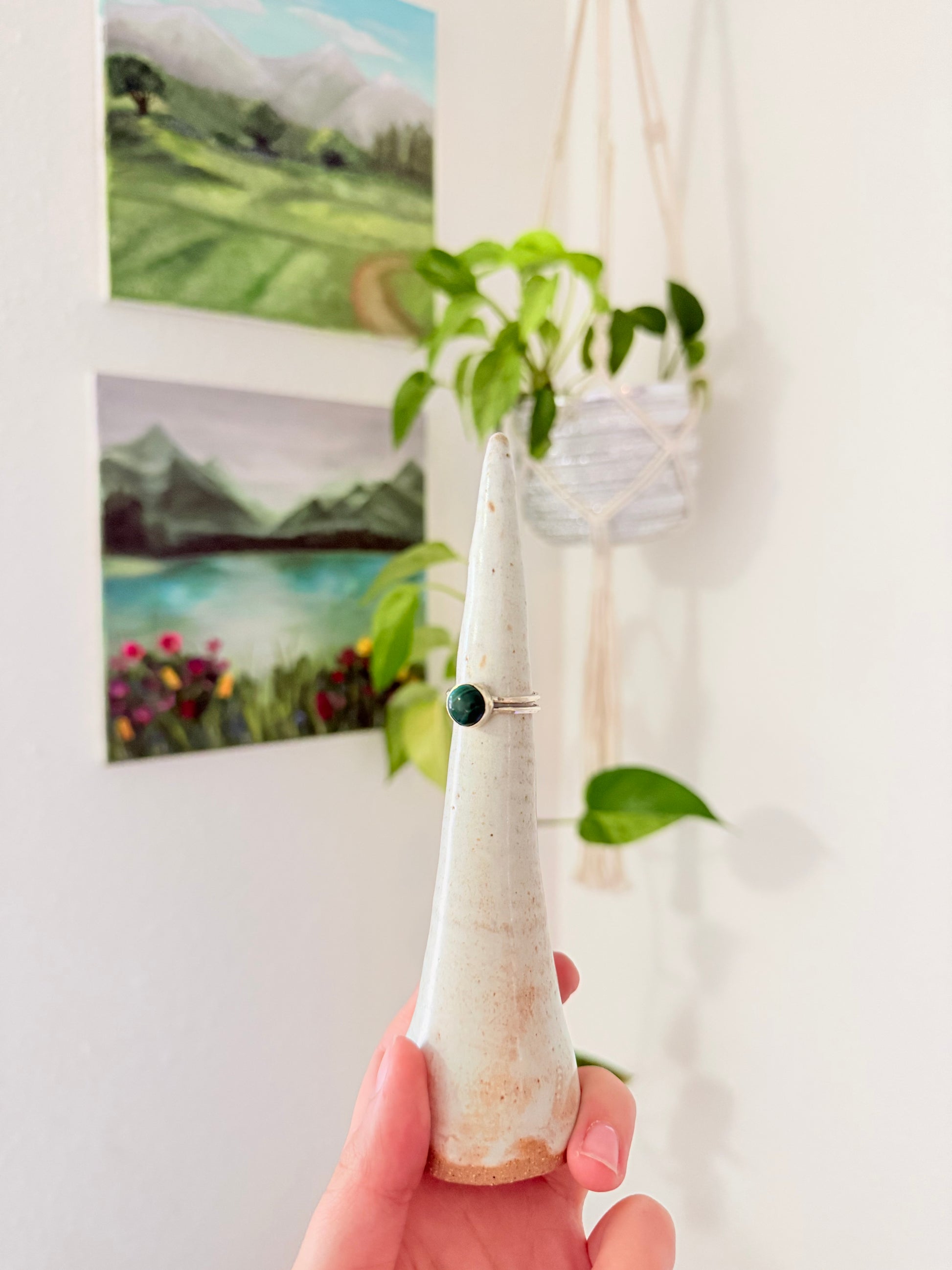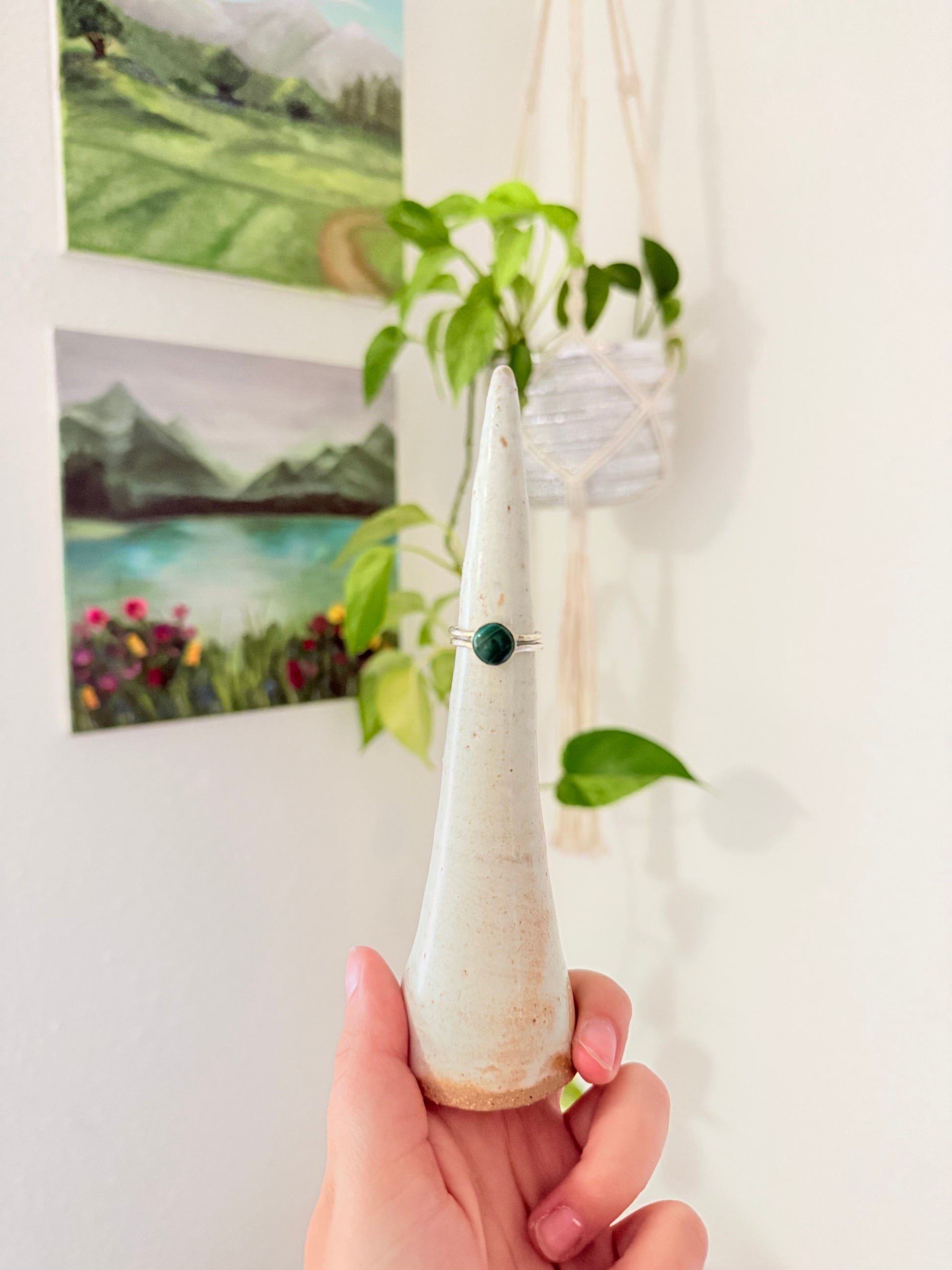 Size 8-8.25 .925 sterling silver ring set with a 9MM green malachite stone on a double band!