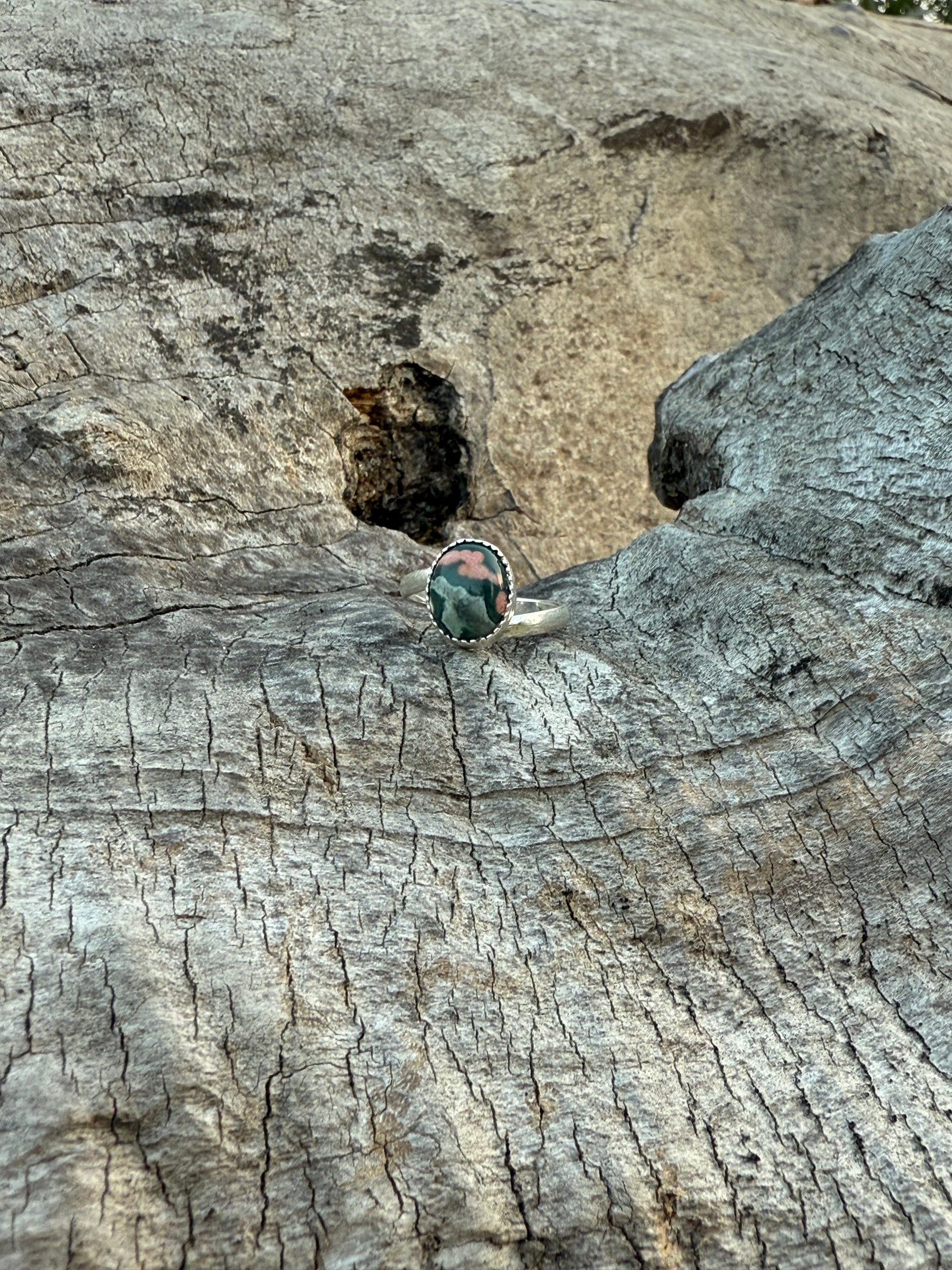 Single split band, crafted with .925 sterling silver and set with a beautiful natural pink and blue Ocean Jasper stone with a serrated bezel!