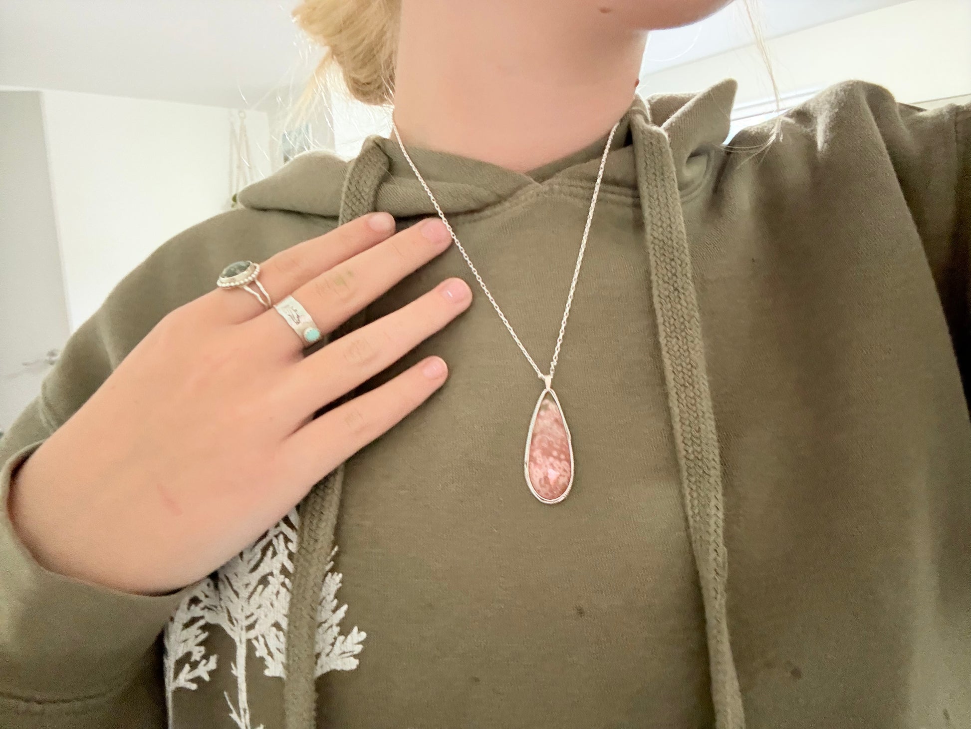 Gorgeous pink Ocean Jasper stone necklace bordered by twist wire and a plain bezel, crafted with .925 sterling silver! On a 1.4mm 18" Sterling Silver Chain!