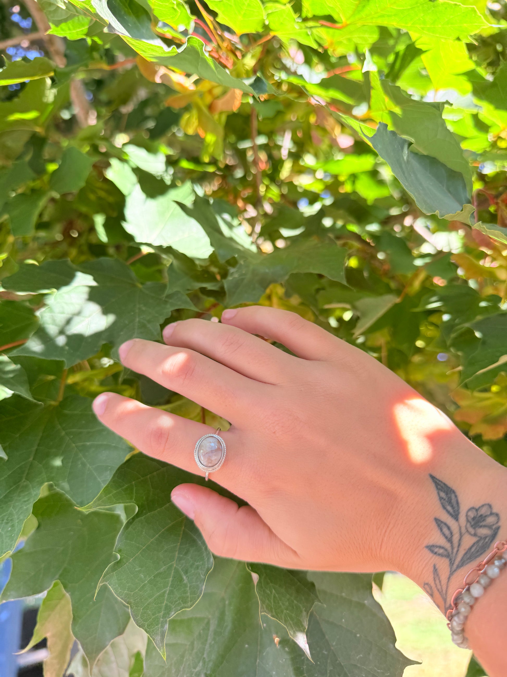 Single band with a twist wire border set with a natural sandy Ocean Jasper stone!