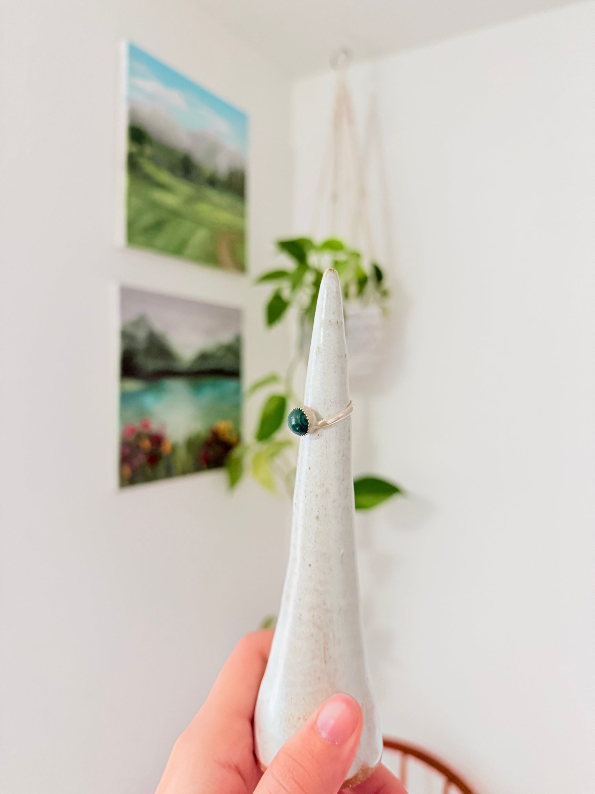 Size 6.5 ring crafted with .925 sterling silver set with a 9MM green malachite stone with a serrated bezel and a split band!
